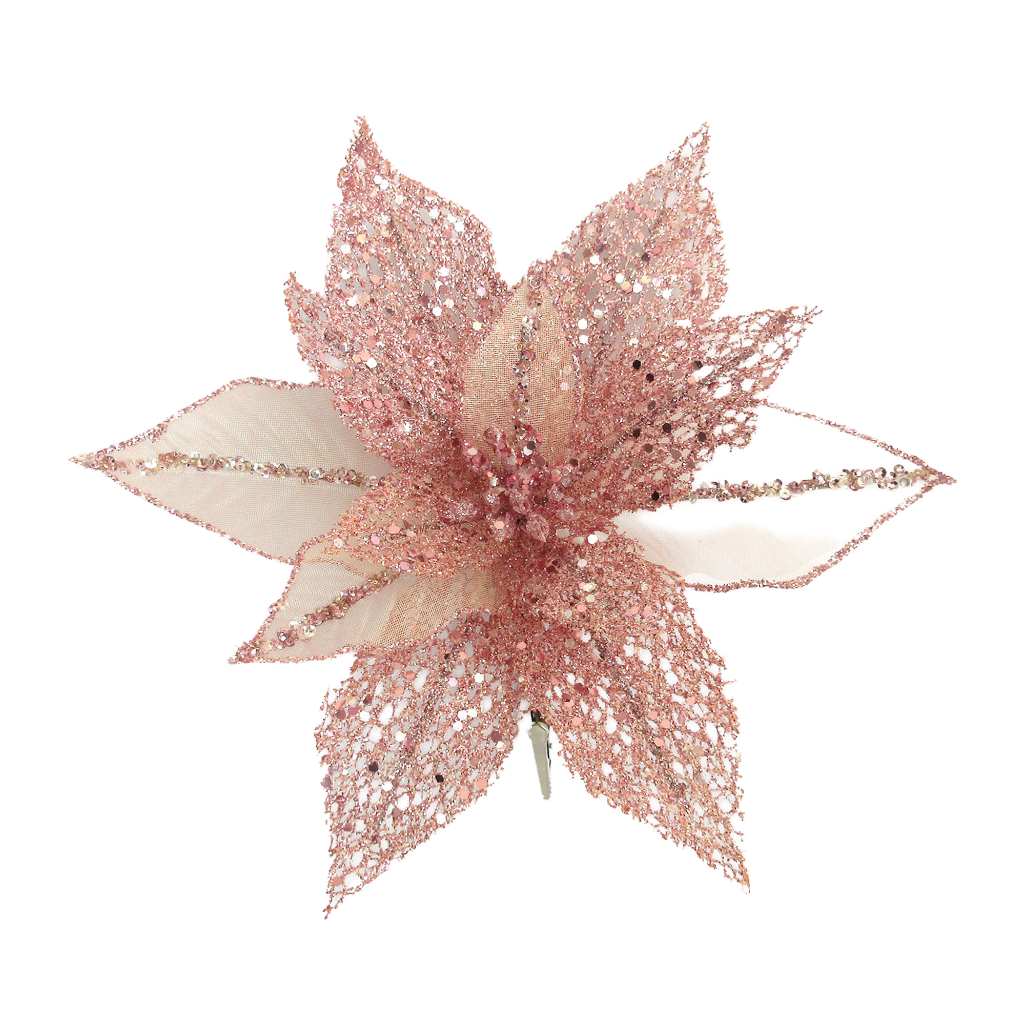 POINSETTIA HEAD SHEER/MESH 9.5″ PINK W/ GLITTER & CLIP
