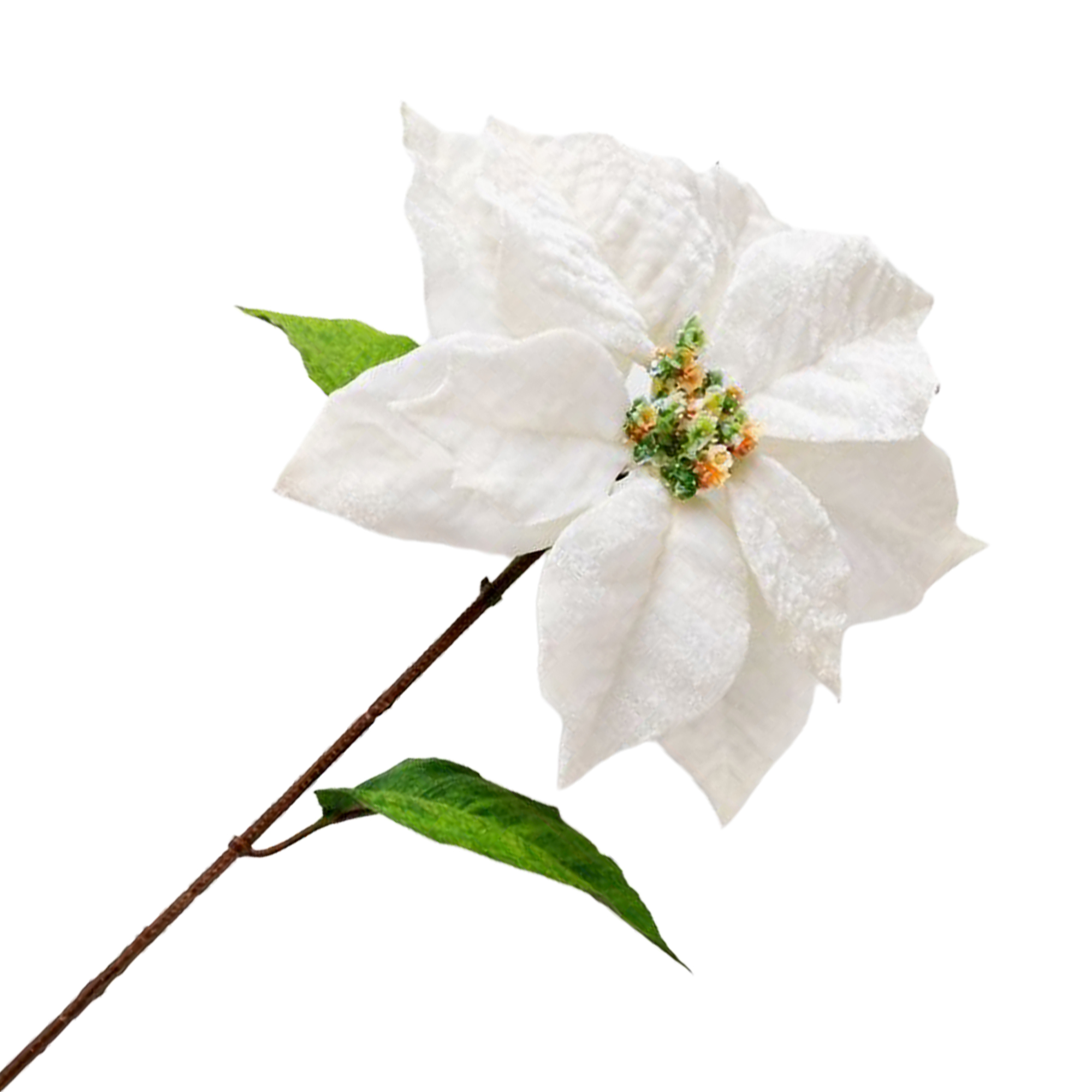Bring the elegance of winter indoors with this stunning poinsettia stem, crafted to evoke feelings of warmth and cheer during the holiday season. The pristine white petals, glistening with a soft shimmer, harmonize beautifully with deep green leaves, creating a classic holiday centerpiece that recalls the timeless traditions of family gatherings and festive celebrations.