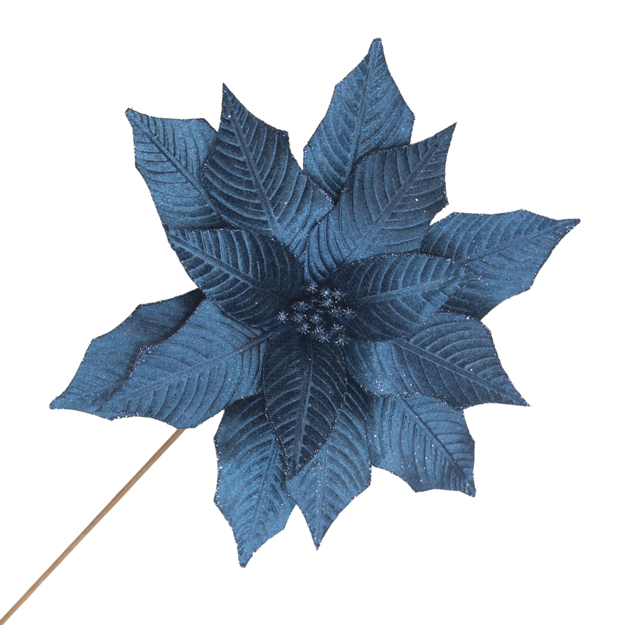This exquisite detailed poinsettia pick captures the essence of winter’s beauty, evoking the timeless spirit of the holiday season. Crafted with an eye for artistry, its deep blue petals are reminiscent of a crisp winters night, inviting a sense of warmth and nostalgia into your festive decor.
