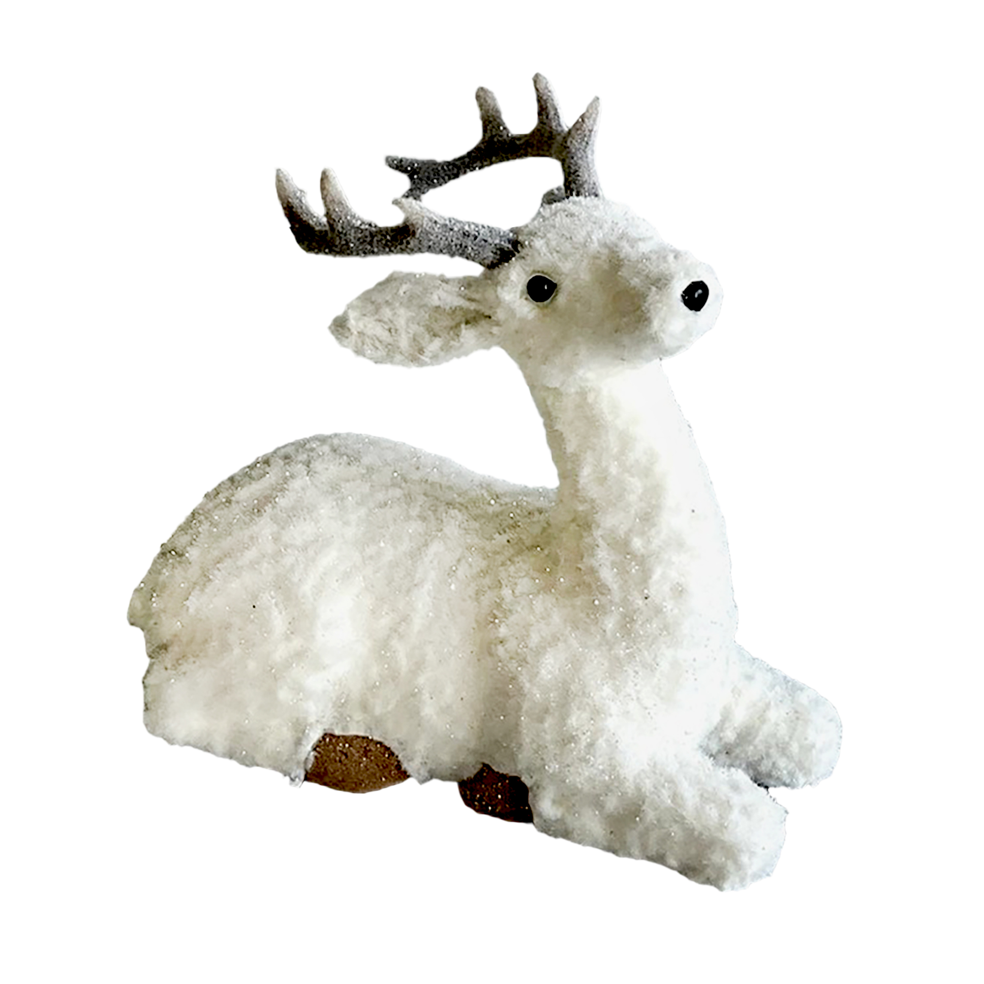REINDEER SITTING 18″ WHITE FAUX-FUR GLITTER & GRAY ANTLERS