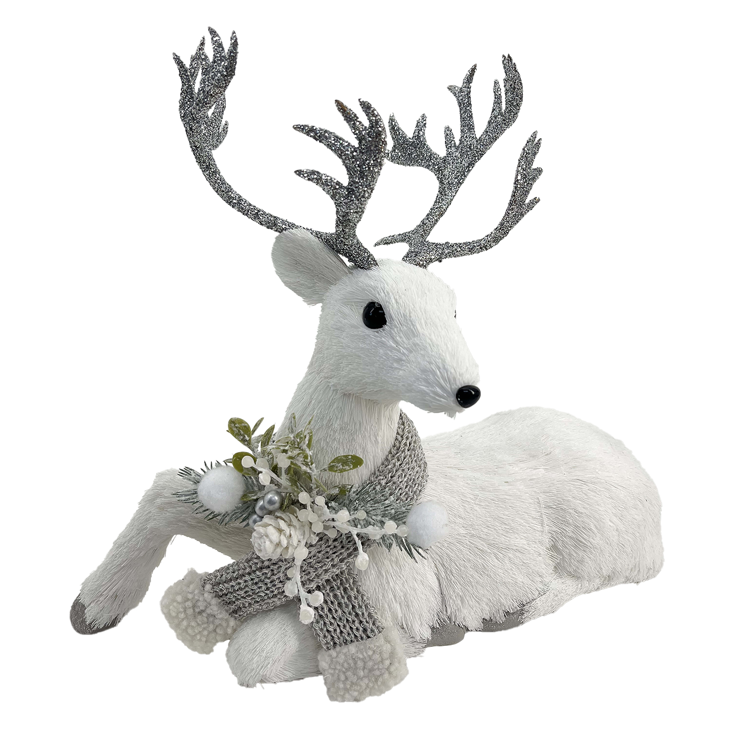 This charming reindeer figure offers a touch of winter elegance, draped in soft, plush fabric that invites a warm touch from your hand. Its enchanting white hue, complemented by shimmering silver antlers, evokes the serene beauty of a snow-covered forest, while the delicate garland tied around its neck adds a gentle nod to timeless holiday traditions.