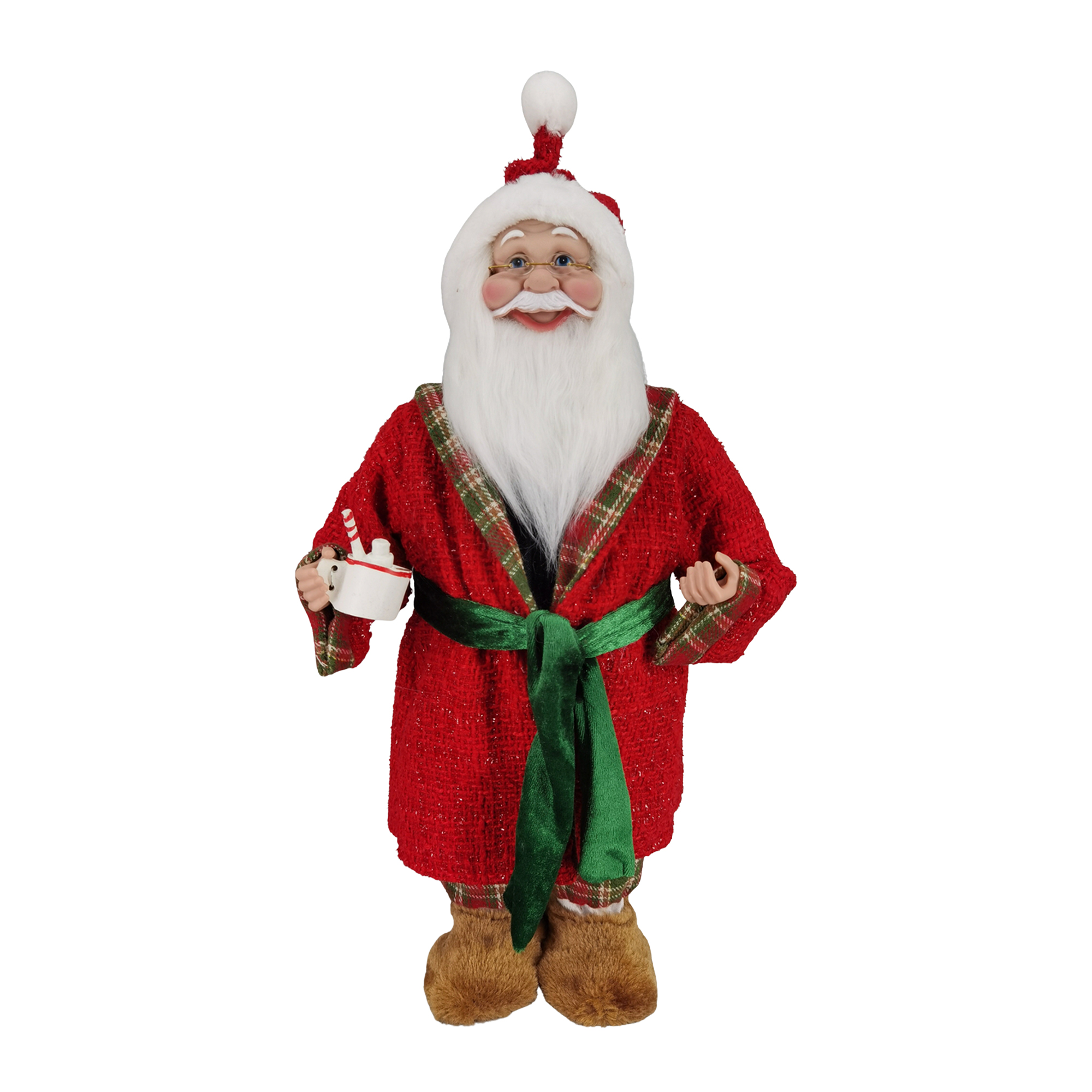 SANTA STANDING 18″ RED/GREEN/BROWN ROBE GOWN HOLDING HOT COCOA