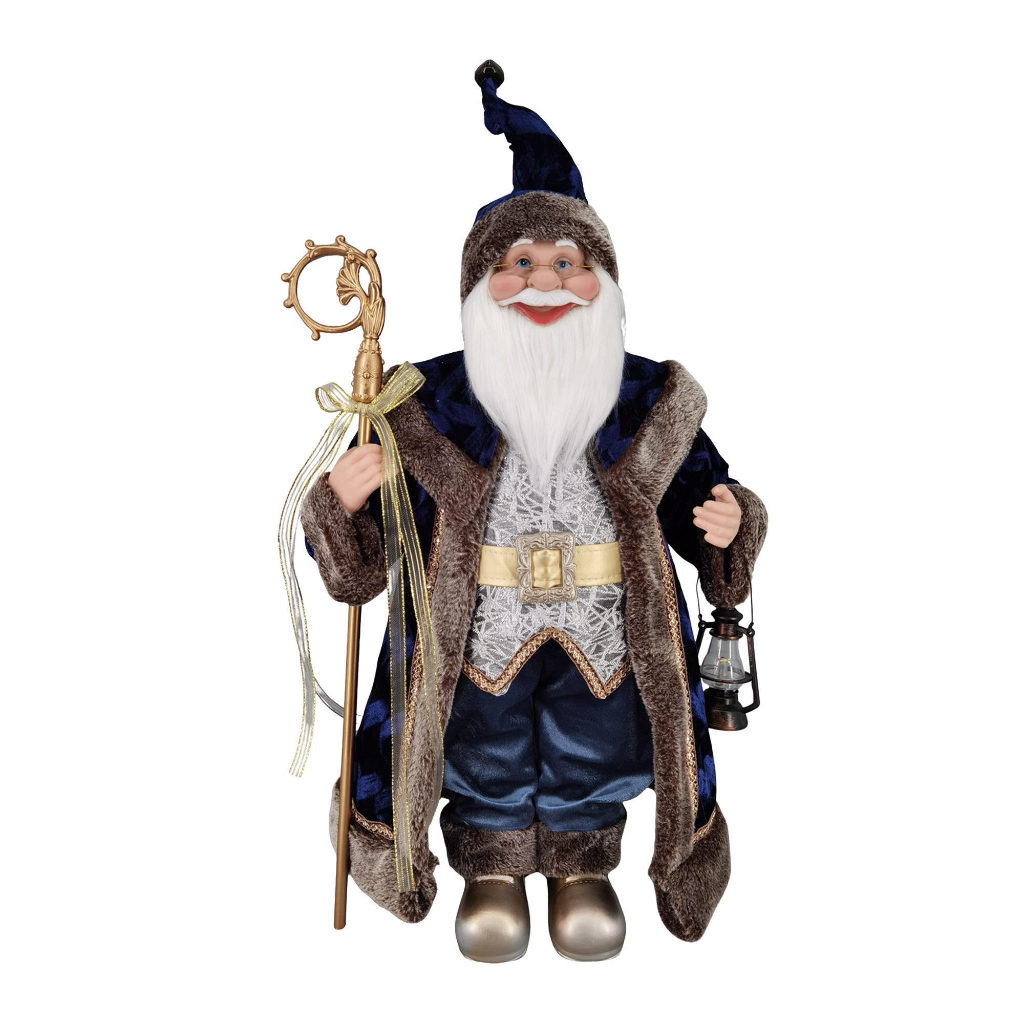 This charming figure encapsulates the essence of the holiday season, featuring a jolly figure draped in a richly textured robe that evokes warmth and nostalgia. His silver-haired beard and twinkling eyes bring to mind a classic winter tale, while the lantern in hand and crafted walking staff suggest a guardian of holiday cheer, perfect for creating an inviting atmosphere in your home.
