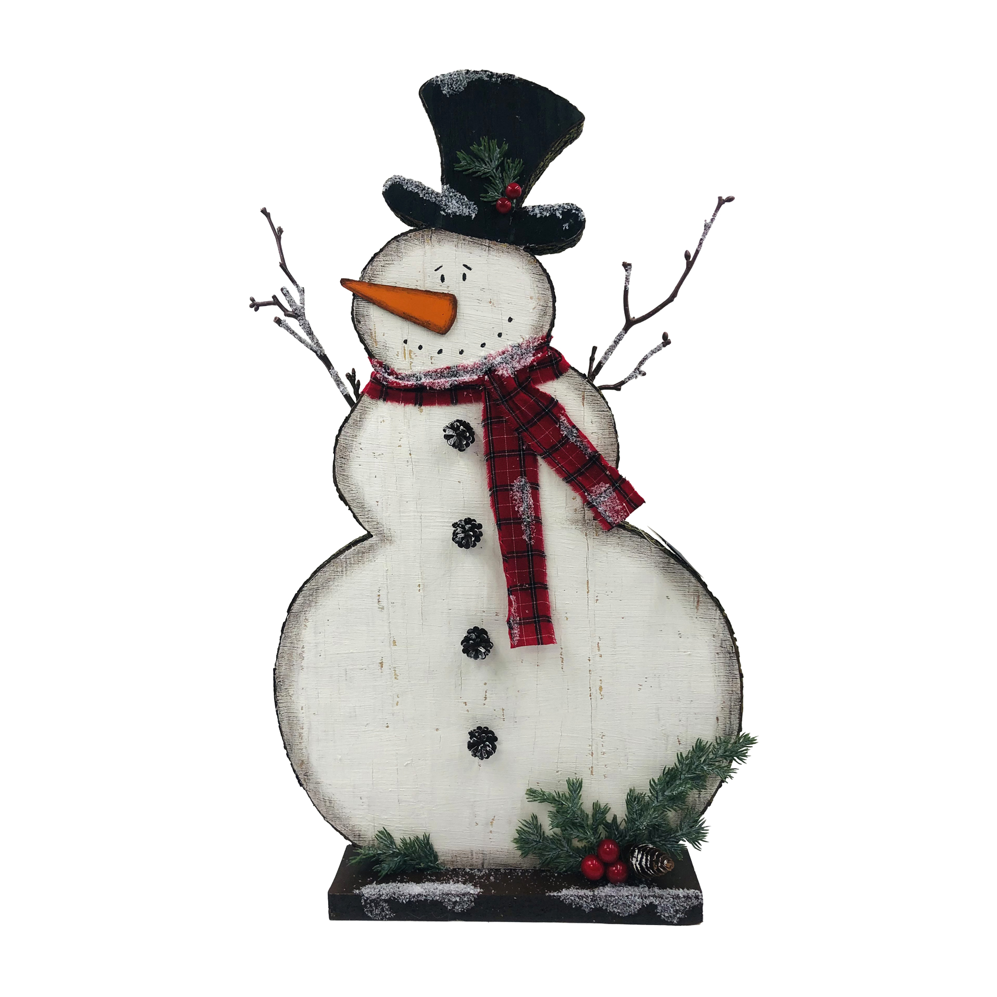A charming addition to your holiday decor, this delightful snowman stands proudly, evoking the warmth of childhood winters spent building snowmen in the backyard. Crafted with care, his cheerful expression is complemented by a classic top hat, a plaid scarf, and the subtle touch of greenery at his base, making him a nostalgic reminder of family traditions and festive gatherings.