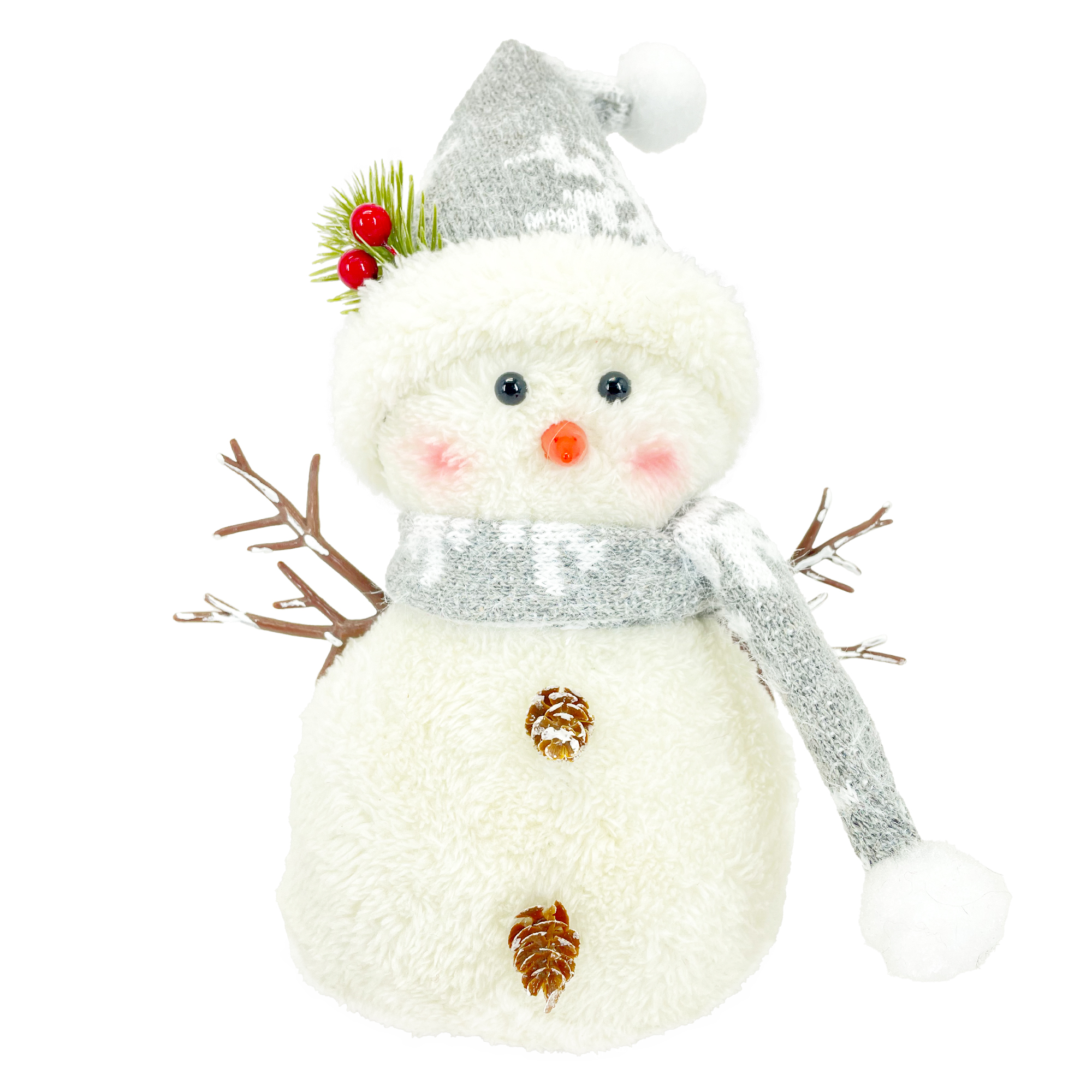 SNOWMAN PLUSH STANDING 11″ GREY/WHITE W/ FUR BODY STRIPE HAT & SCARF