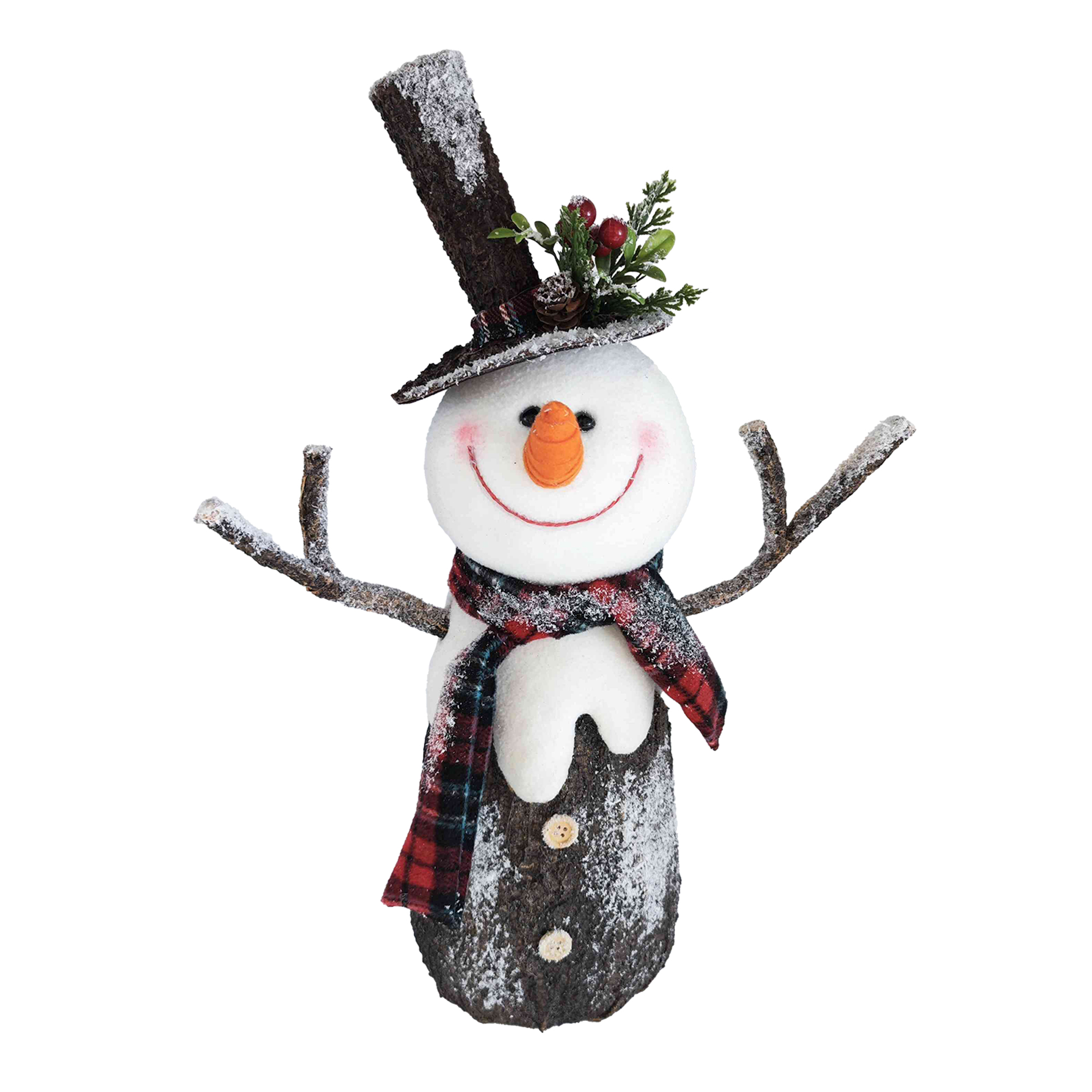 SNOWMAN STANDING LOG-STYLE 20″ W/ PLAID SCARF, SNOW, & BERRY-DECORATED HAT