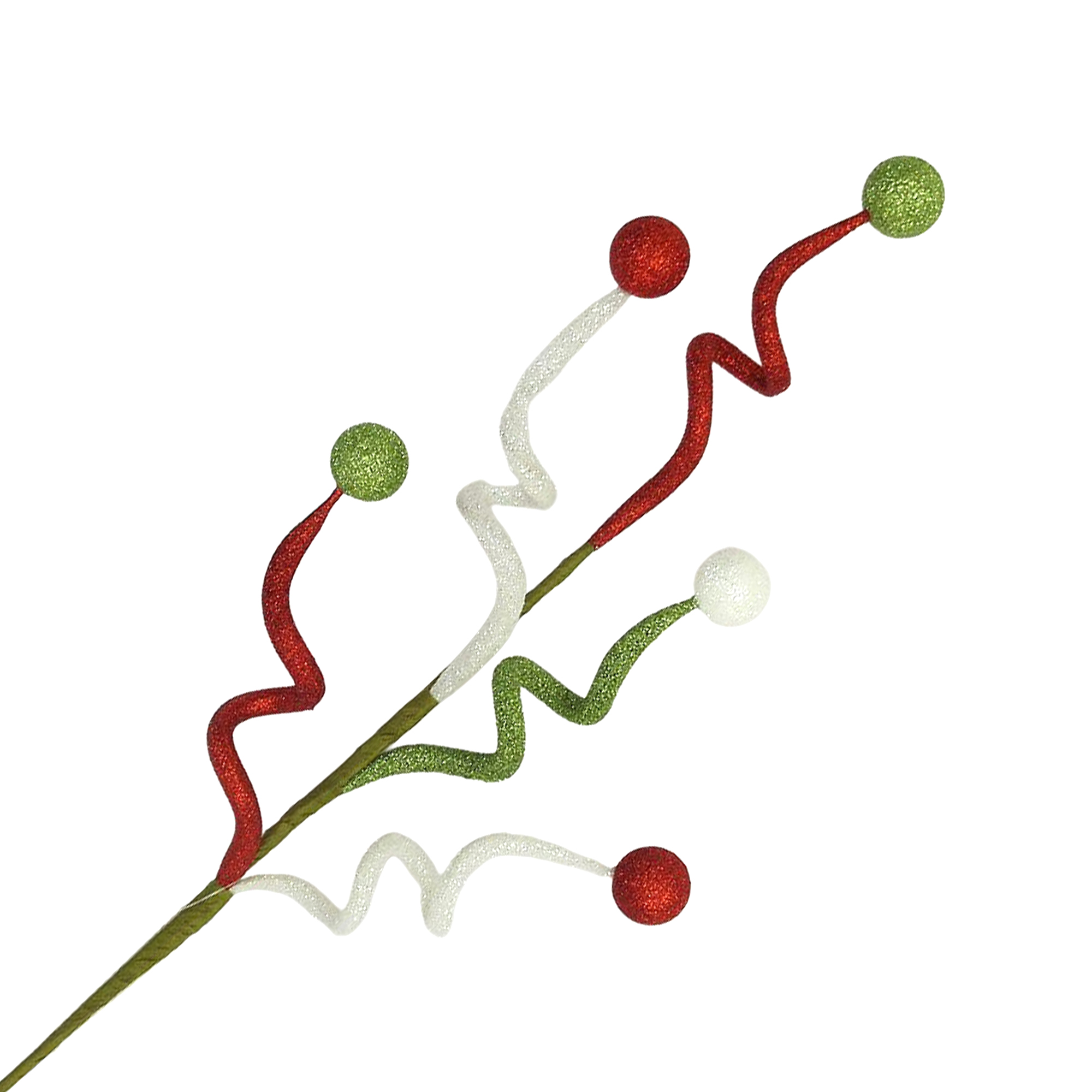This charming decorative sprig captures the essence of holiday spirit with its playful twist of colors and shapes. Adorned with vibrant red and green balls interspersed along a winding white stem, it evokes a sense of whimsy and joy that is perfect for enhancing any festive arrangement. This piece reflects a commitment to craftsmanship, bringing a handmade warmth to your holiday décor.