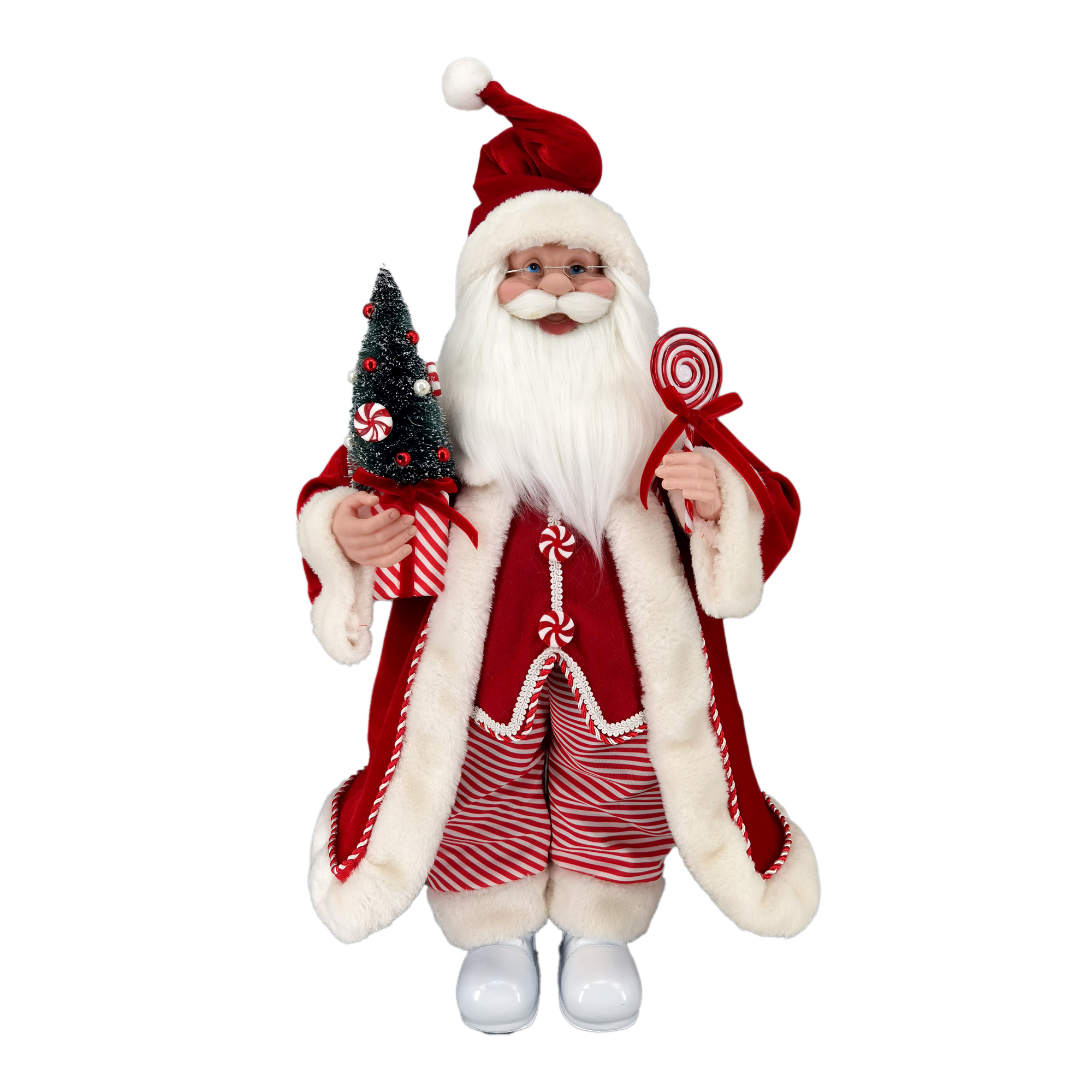 This charming representation of the jolly old elf captures the spirit of the season with his vibrant red coat adorned with white fur trim. Clutching a festive candy cane and a petite tree, he brings a nostalgic warmth to holiday gatherings, reminding us of cherished family traditions and the joy of giving.