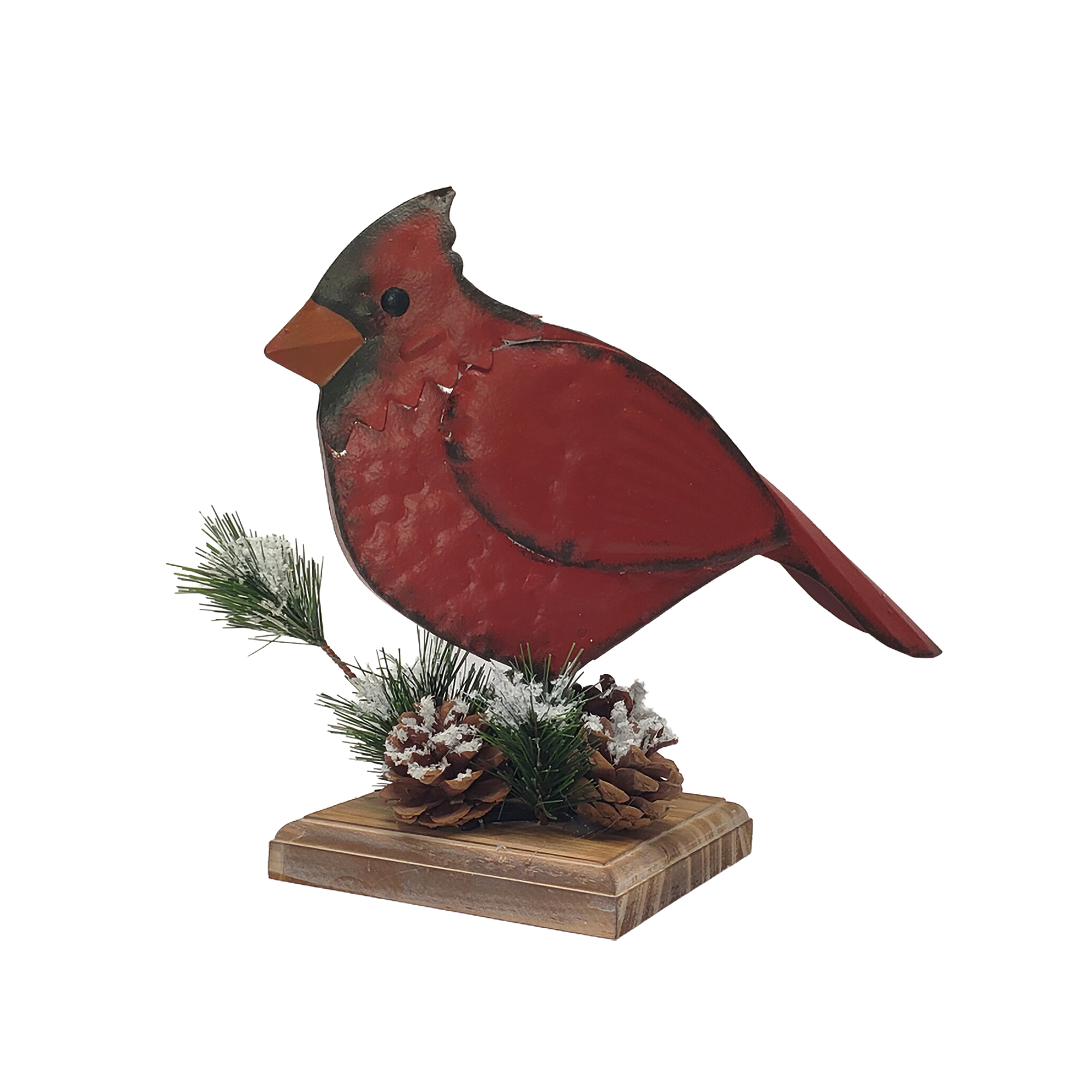 Celebrate the spirit of the season with this charming cardinal figure, a timeless reminder of the warmth of home and the beauty of nature during winter. Crafted from sturdy metal, the vivid red hue captures the essence of this beloved bird, while the rustic wooden base and natural pinecone accents evoke a nostalgic feeling reminiscent of simpler holiday times.