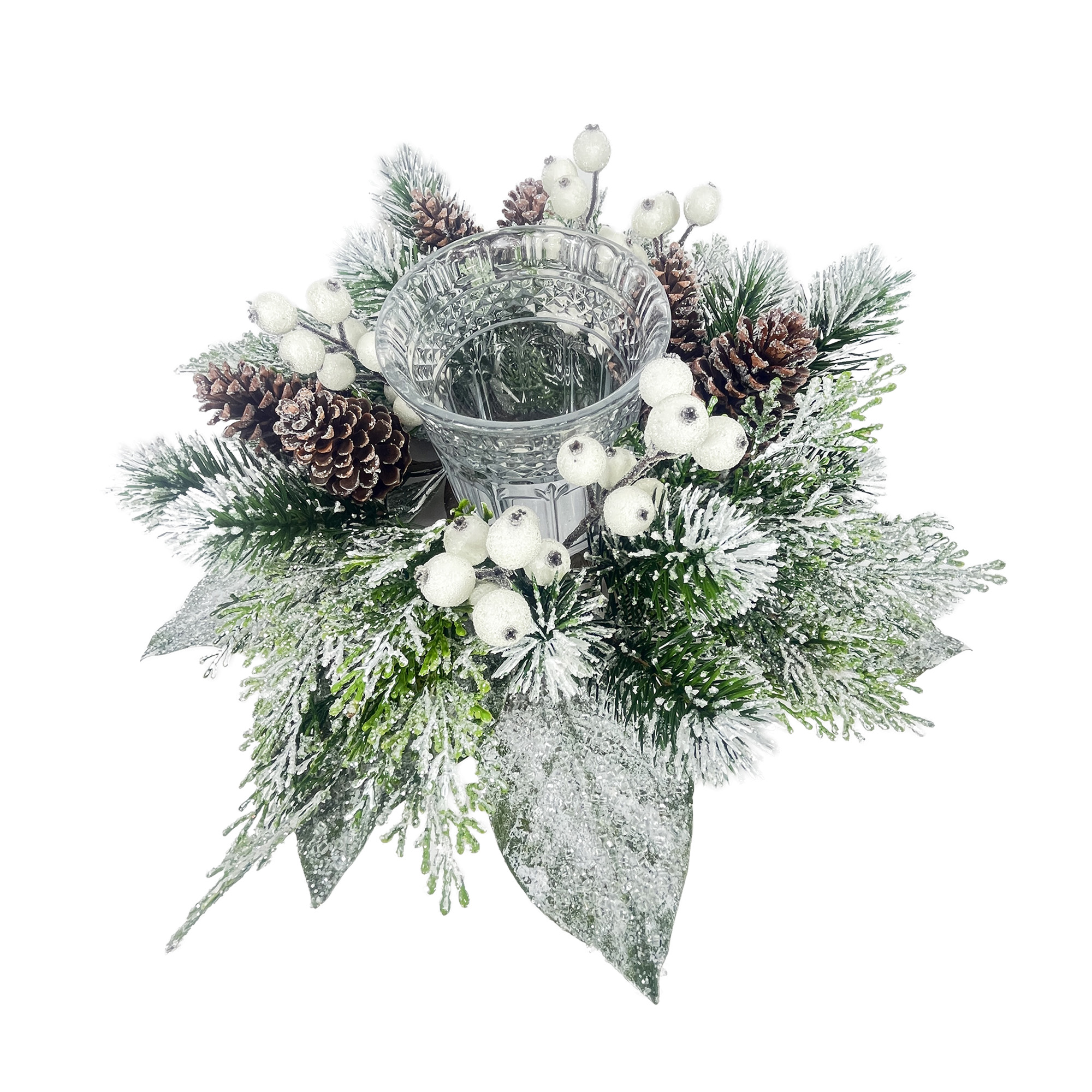 TABLE DECOR FROSTED WHITE BERRY/MIXED NEEDLE PINE & MAGNOLIA LEAF 16X3″ W/ GLASS
