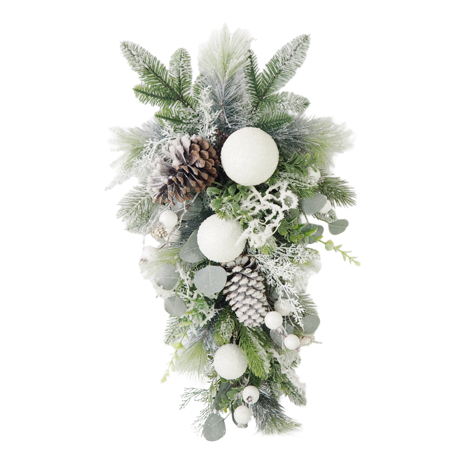 TEARDROP PINE FROSTED 30″ MIXED PINE W/ PINE CONES & SNOW BALLS