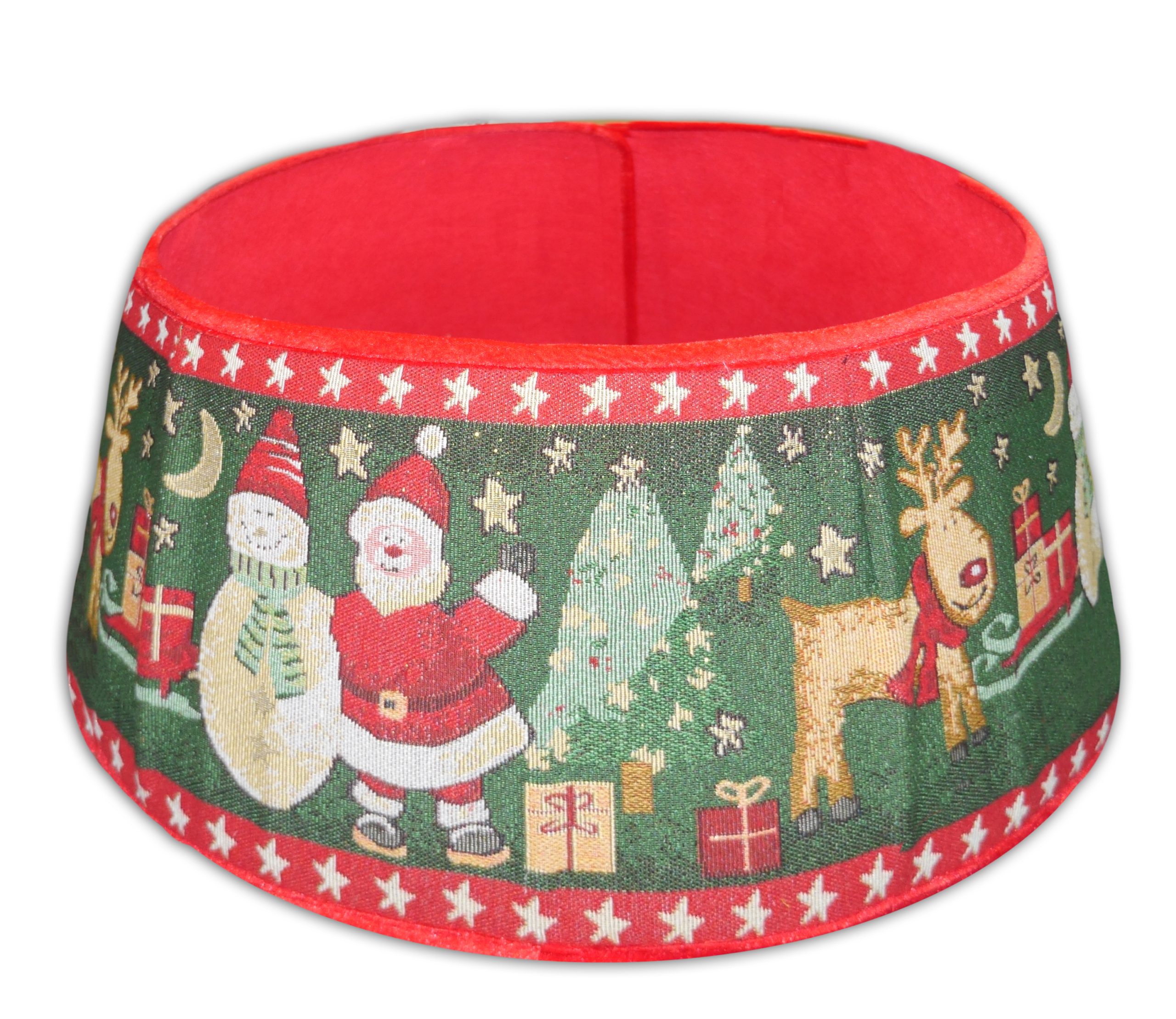 TREE COLLAR 10.5″X24″ MULTICOLOR TAPESTRY ROLL UP SANTA, SNOWMAN & REINDEER DESIGN