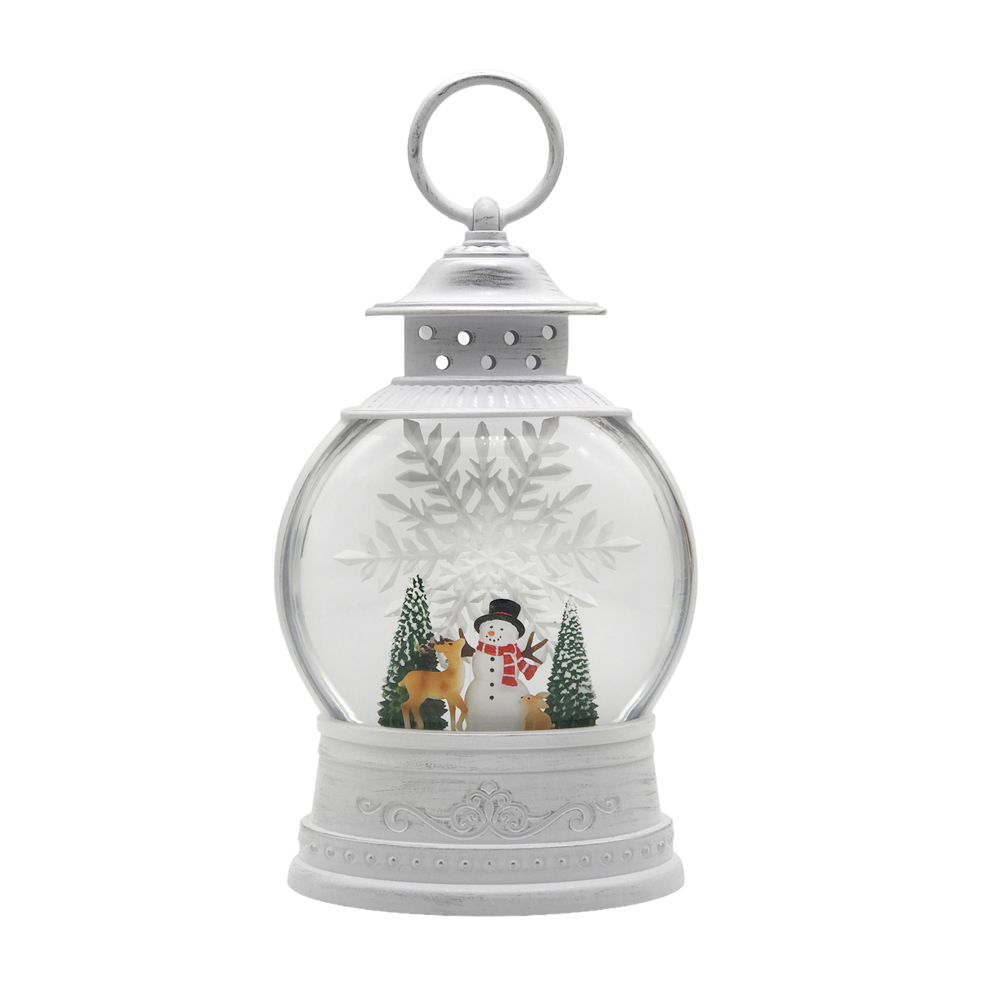 This enchanting winter lantern captures the spirit of the season, bringing to life a charming scene of a snowman adorned with a bright scarf and two festive evergreen trees. The gentle snowfall, mesmerizing within the glass dome, evokes cherished memories of winter wonderlands and family gatherings around the hearth.