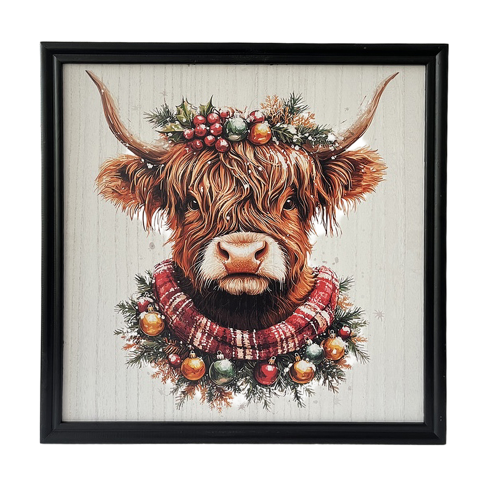 This charming artwork captures the spirit of Christmas with a delightful depiction of a Highland cow adorned with a seasonal wreath. The warm tones of the cow’s woolly coat, complemented by rich greenery and festive ornaments, evoke memories of joyful gatherings and rustic winter celebrations. Framed in classic black, this piece serves as a timeless reminder of the beauty found in both nature and the holiday season.