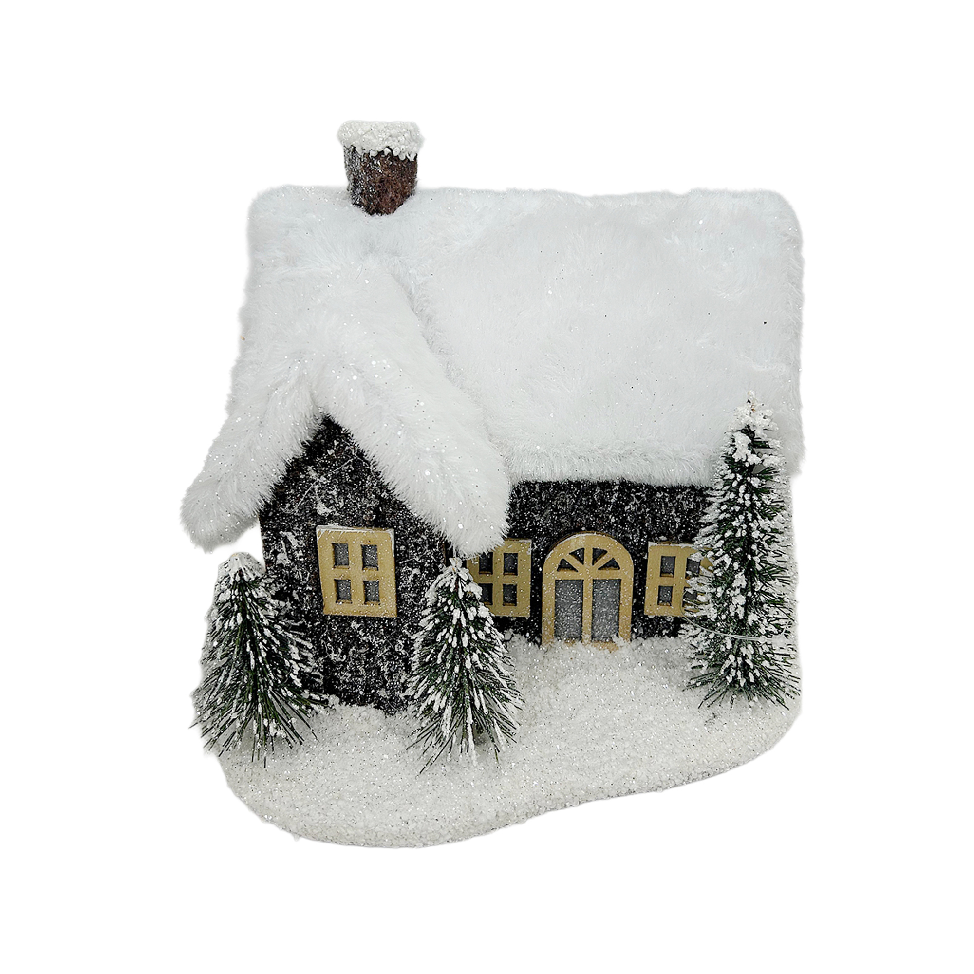 WOODEN HOUSE 8″X8″ BROWN LED W/TIMER, LATTICE WINDOWS & & FUR- SNOWED ROOF