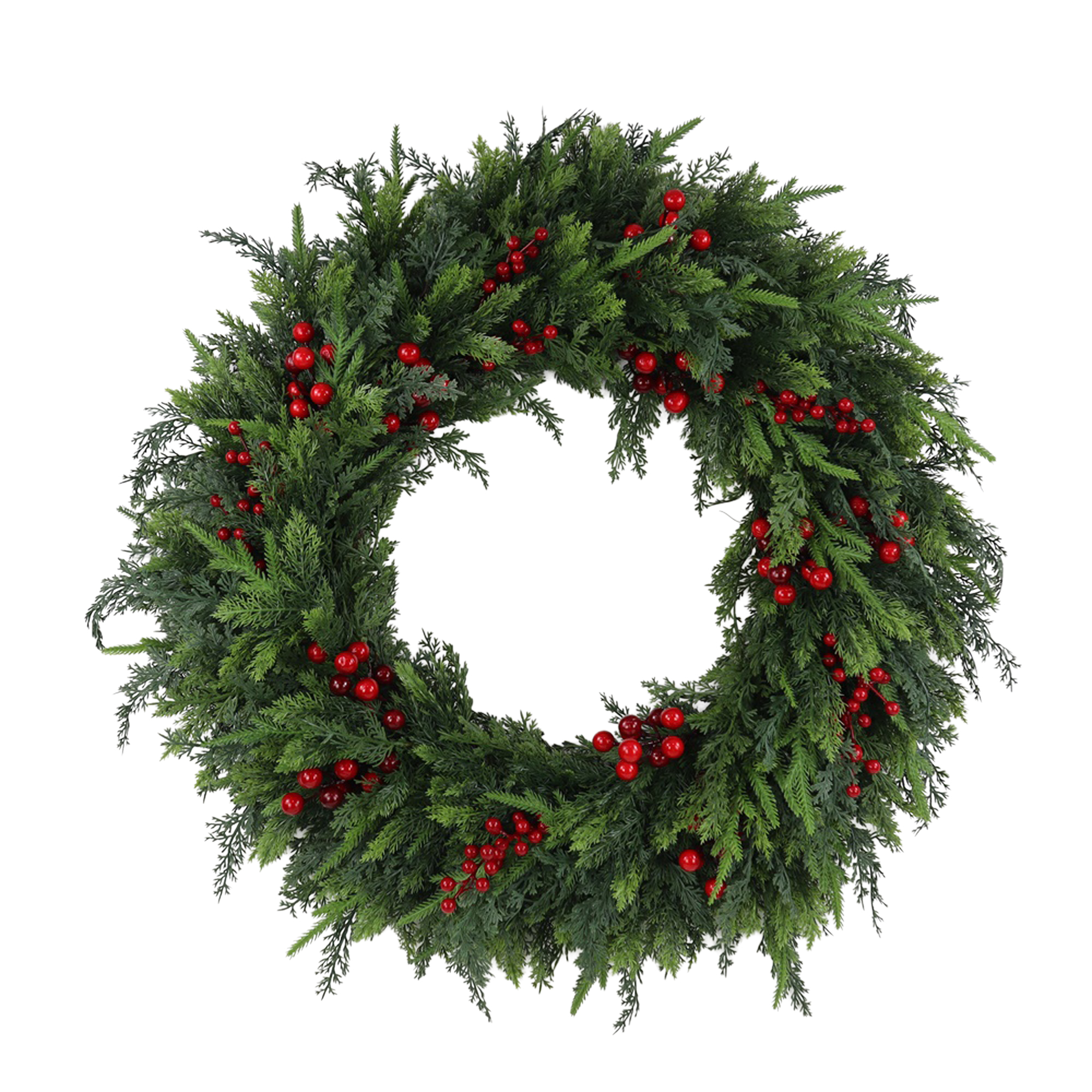 This exquisite wreath brings the charm of a winter woodland into your home, showcasing a lush assembly of cedar greenery intertwined with vibrant red berries. Crafted to evoke the nostalgic spirit of the season, it serves as a welcoming centerpiece to your holiday decor, inviting warmth and cheer upon each entrance.