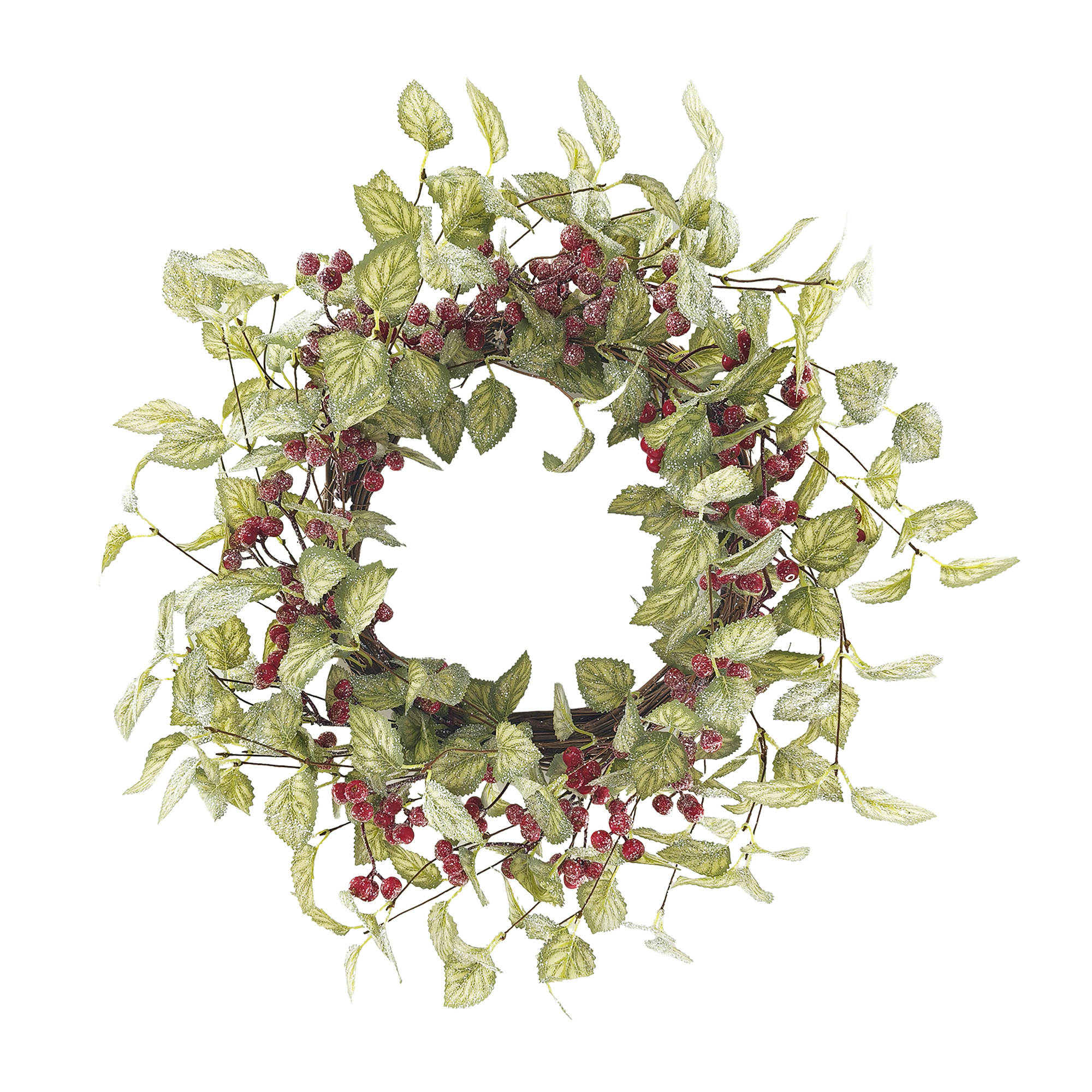 WREATH MULBERRY LEAF SAGE GREEN 22″ GLITTER W/ RED BERRIES